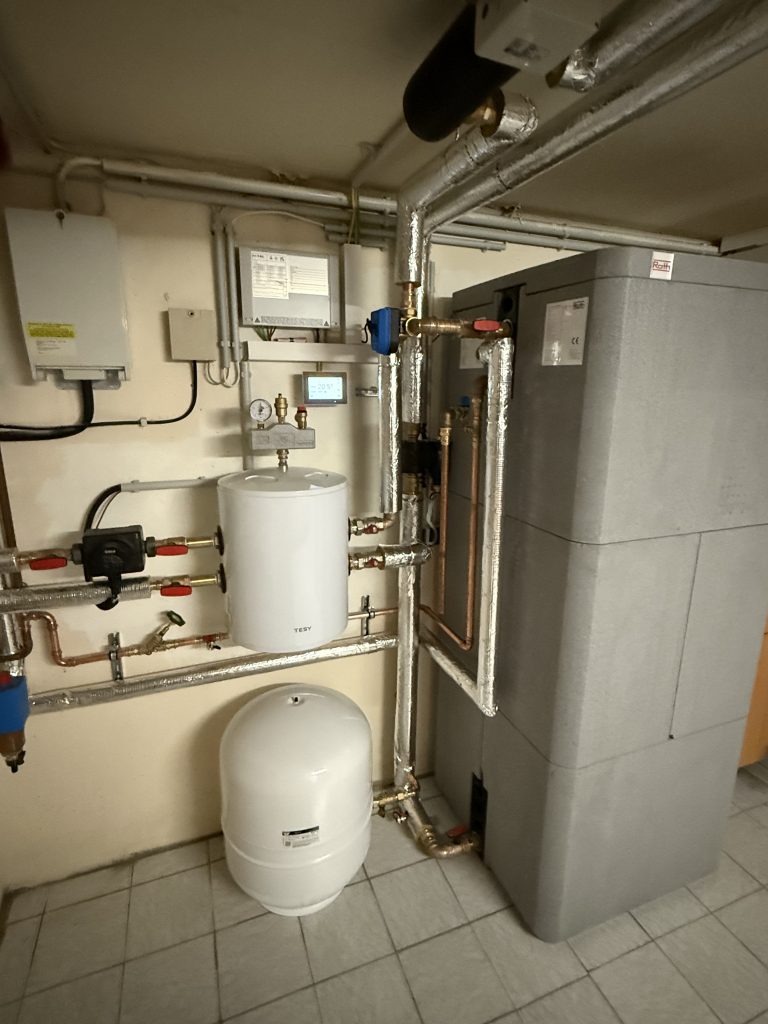 Ausgangspunkt war eine klassische Gas-Dachzentrale, deren Technik vollständig in den Keller verlegt wurde. Im Zuge dieser Umstrukturierung wurde das Gebäude auf eine moderne Wärmepumpe umgestellt, die optimal auf die vorhandenen Gegebenheiten abgestimmt ist. Besonders bemerkenswert: Die bestehenden Heizkörper konnten weiterhin genutzt werden, wodurch aufwendige Umbauten vermieden wurden.